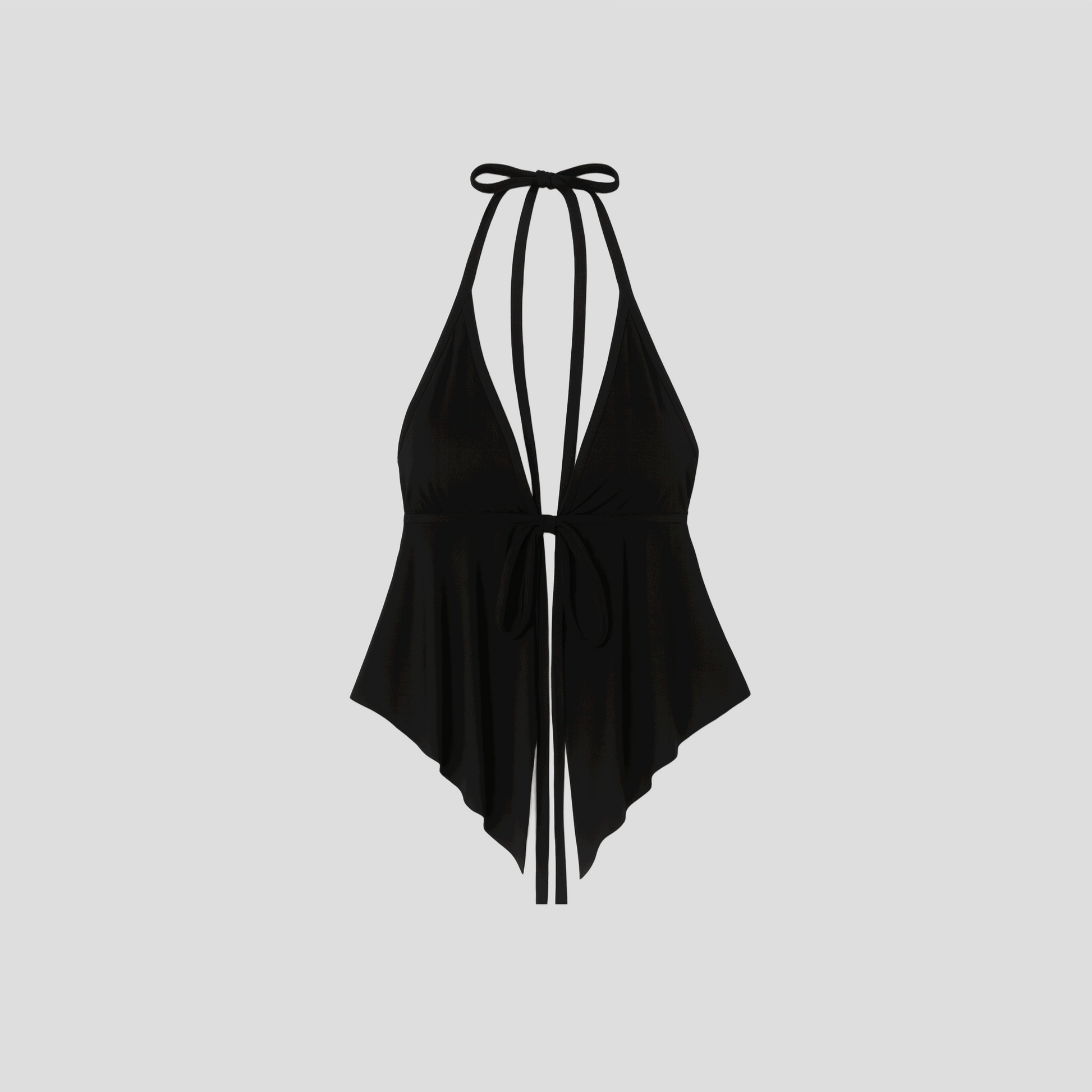Este top es un halter licrado en color negro, con un diseño que combina sensualidad y fluidez: